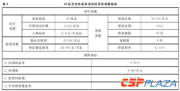 目前塔式技術是最為成熟的光熱發電技術。以該技術為例,若項目位于青海等光照條件較為優越的地區,單位千瓦造價控制在20000^30000元,上網電價確定為1.2元/千瓦時,則項目能夠依托自身現金流實現商業化運營。具有代表性的10兆瓦塔式項目模擬測算指標如下表所示。