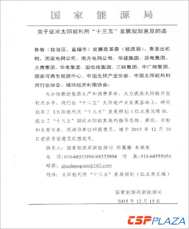 CSPPLAZA光熱發電網訊:國家能源局(ju)于12月15日向各省(自治區、直轄(xia)市)發改委能源局(ju)等(deng)有(you)關部門下發《太陽能利用十三(san)五發展(zhan)規劃征求(qiu)意見(jian)稿(gao)》(簡稱意見(jian)稿(gao)),要(yao)求(qiu)于12月30日前將書面意見(jian)反饋至(zhi)國家能源局(ju)新能源司。