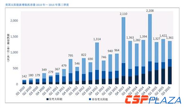 美國太陽能市場保持著破紀錄的發展勢頭,在2015年第三季度中新增裝機容量為1361兆瓦,在2015年太陽能市場前三個季度中提升了4.1吉瓦。得益于住宅太陽能市場的快速發展,2015年第三季度成為美國太陽能裝機容量連續增長的第八個季度,太陽能裝機容量增加超過1吉瓦。