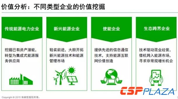 中國能源互聯網的商業生態系統由各類企業和各類用戶組成,它們不僅得益于改革的“政策紅利”,更得益于互聯網帶來的“科技創新紅利”,能以較低成本采用先進的信息通信技術,從而提高個體和整個生態系統的自我更新能力。傳統能源企業及用戶、能源產消合一者、普通互聯網用戶最終將整合在同一平臺中,通過企業與用戶間的數字化互動而拓展產業價值鏈。
