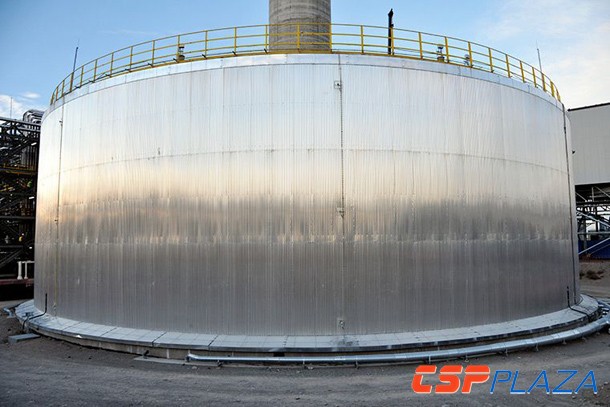儲電容量相當于1100MWhe的儲熱系統,最多可滿足10小時的連續無輻照運行。這使之成為全球儲能能力最強的太陽能電站,同時也是無需任何化石燃料輔助的光熱電站。儲熱罐40英尺高(約(yue)12米)、直徑140英尺(chi)(約(yue)43米)。冷(leng)罐由碳鋼制成,熱罐由不銹鋼制成,單個罐子可容納熔鹽7000萬磅(約31751噸)。