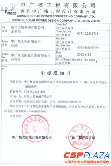 CSPPLAZA光熱發電網訊:2012年6月15日,浙江大明玻璃有限公司(以下稱大明玻璃)在中廣核青海德令哈太陽能光熱發電技術試驗基地菲涅爾反射鏡公開招標中中標,成為該項目太陽能光熱發電用反射鏡唯一國內供貨商。