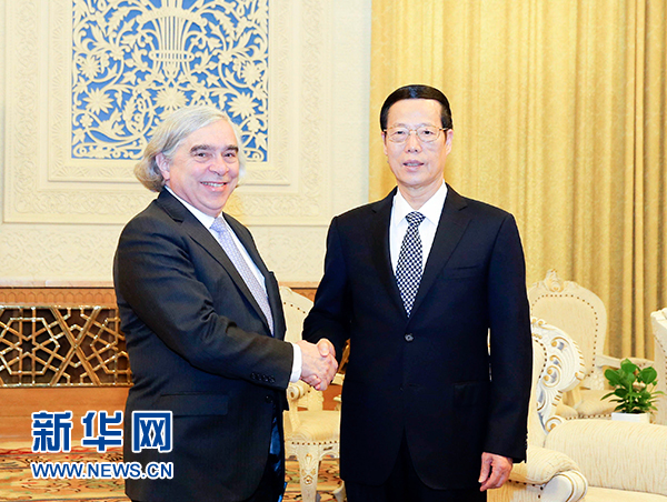 張高麗表示,當前中美關系總體保持穩定發展。雙方應繼續認真落實兩國元首達成的共識,加強溝通協調,拓展各領域交流合作,建設性地管控分歧,確保中美關系沿著構建新型大國關系的正確軌道向前發展。中美在能源、氣候變化等領域的合作取得了豐碩成果,形成了全方位、多層次的能源合作框架。希望雙方加強民用核能、電網建設、清潔能源、低碳城市等領域的務實合作,推動中美能源合作水平不斷邁上新臺階,為全球能源可持續發展和應對氣候變化作出貢獻。