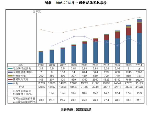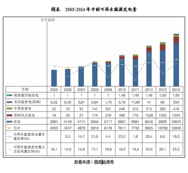 可再生能源發電總裝機容量從2010年的2.54億千瓦增加到2014年底的4.36億千瓦,在全國總發電裝機中的比重從2010年的26.0%增加到2014年的32.0%;2014年可再生能源總發電量比2010年增長近一倍,在全部發電量中的比重也從2010年的18%增加到2014年的23.2%,其中水電增加了3.1個百分點,風電增加了1.6個百分點。風電、太陽能發電在內蒙古、甘肅、青海等地發電量中的比重均超過了10%,成為當地重要的新增電源。