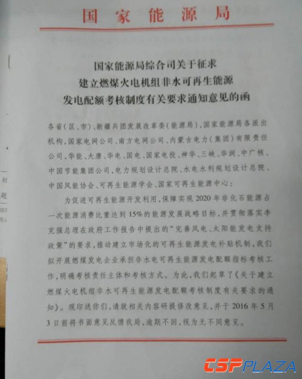 這份名為《關于建立燃煤火電機組非水可再生能源發電配額考核制度有關要求的通知》為國家能源局起草,還沒有正式作為文件公布并執行,但國家能源局要求5月3日前,國家電網、華能、大唐、華電、國電、國家電投等重量級電企迅速給出回應。如果不將意見反饋至國家能源局,將視為無不同意見。