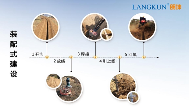 在現場建設過程中,超長的接地單元可通過朗坤電氣專業的開溝機械開挖放線,速度是普通機械的五倍,形成了一種全新的積木式的搭建模式,使施工更加便捷,提高了施工效率,節省了人工,施工過程中朗坤電氣使用的放熱焊接技術,在一分鐘內就可以實現接地模塊間分子式的連接,縮短了施工周期以及規避了由人工操作帶來的不安全隱患,有效杜絕了接地系統的均壓問題,熱穩定問題和點腐蝕問題。