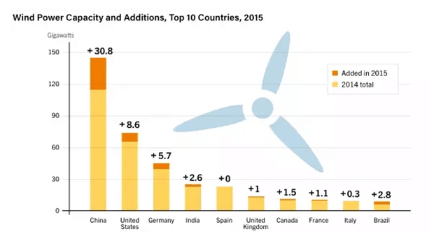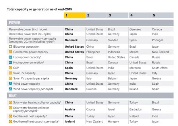 在總發電量方面,截至2015年末,中國在水力發電、水力容量、太陽能容量、風能容量、太陽能熱水容量、地熱能容量上均位居世界第一。
