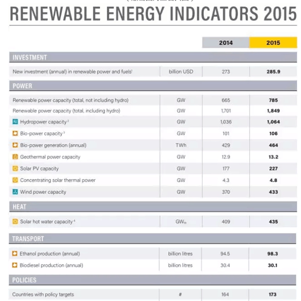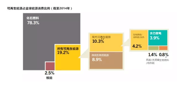 報告顯示,可再生能源裝機量在2015年創下新紀錄。新增可再生能源發電裝機容量約147GW,為歷年最高。同時,現代可再生能源熱容量保持增長態勢,可再生能源在交通領域的應用也在擴大。分布式可再生能源的快速進步正在縮短能源富有群體和能源短缺群體之間的差距。報告還公布了可再生能源占全球生產、消費總量的比例: