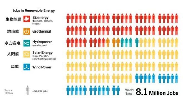 報告指出,與投資增長隨之而來的是技術進步、成本下降,和更多的就業崗位。當前,共有810萬人工作在可再生能源領域——可再生能源行業穩定增長的就業率同整體能源行業勞動力市場的蕭條形成了鮮明對比。