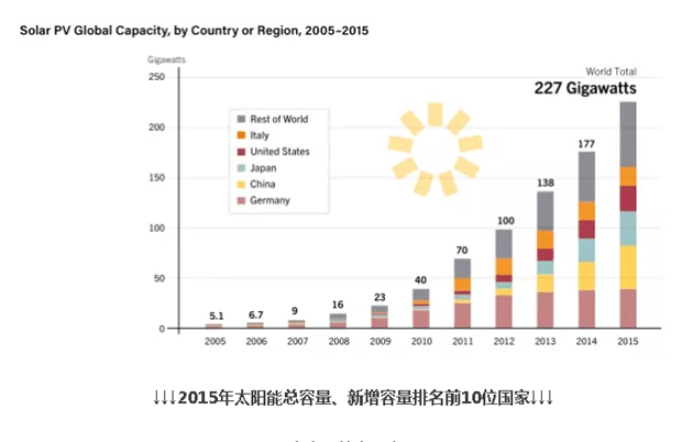 2005年~2015年各主要國家/地區太陽能容量增長分布情況
