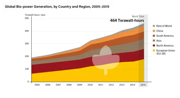 4.截至2015年生物質能發電總量為464萬億瓦時