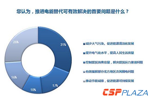調查結果顯示,環境污染無疑是大家極為關心的問題。針對推進電能替代可有效解決的首要問題,31%的受訪者認為,電能替代將有效減少大氣污染、促進能源清潔化發展;26%的受訪者認為,推動節能減排、促進能源可持續發展;16%的受訪者認為,有效緩解部分北方地區棄風限電問題。其他受訪者認為電能替代可有效解決提升電氣化水平、提高人民生活質量和控制煤炭消費總量、解決煤炭運力緊張問題。