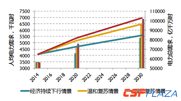 根據國家氣候戰略中心(NCSC)基于PECE模型的測算,在經濟下行情景、溫和復蘇情景和強勁復蘇三種情景下(如下圖所示),中國到2030年的人均用電需求都將持續上升。2020年的人均用電需求將達到4600-5400千瓦時/人,2030年將達到5500-7000千瓦時/人。