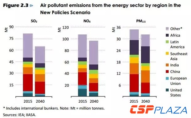IEA的報告認為,能源生產和使用,尤其是不受監管、不規范的或低效率的燃料燃燒,是目前主要的人為空氣污染的來源——85%的顆粒物和幾乎所有的硫氧化物和氮氧化物都來源于此。經濟不發達地區使用木柴和其他固體燃料進行的炊事活動,以及化石燃料密集型發展和城市化都不同程度的加重了空氣污染。