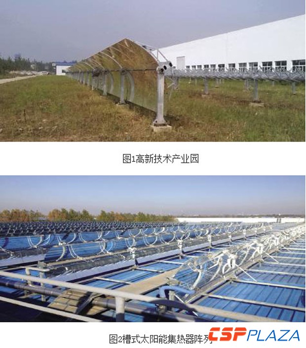 項目建設地址位于湖北省黃岡市禹王高新技術產業園(如圖1所示),占地面積5000平方米。項目除解決辦公樓的空調外,太陽能集熱器的熱能還能解決車間的零件烘烤預熱。槽式太陽能集熱器陣列如圖2所示。