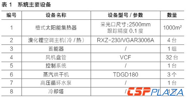 此示范平臺系統主要由槽式太陽能集熱器、溴化鋰空調主機、蓄能裝置、風機盤管、蒸汽烘干機、高壓循環水泵、冷卻塔和控制系統八大部分組成。系統主要設備如表1所示。