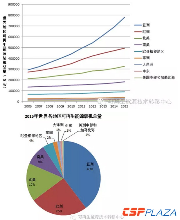 2015年,亞洲、歐洲和北美洲的可再生能源裝機容量超過世界整體裝機容量的86%,其它地區只占不到14%。