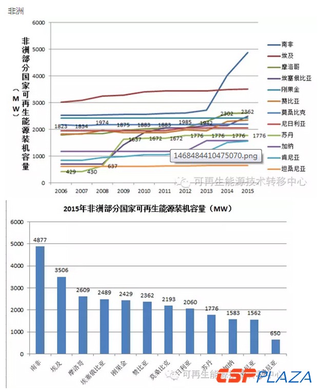 非洲地區可再生能源裝機容量在世界排名靠后,這主要是由于非洲地區經濟的不發達性和能源生產的落后性。可以看出,進入2013年后,非洲地區的部分國家可再生能源裝機容量驟然上升,例如南非、蘇丹、贊比亞、埃塞俄比亞、加納和肯尼亞。(途中帶有數據標簽的贊比亞和加納是“中非可再生能源技術轉移南南合作項目”的首批受援國,目前正在國內大力推進可再生能源建設)。