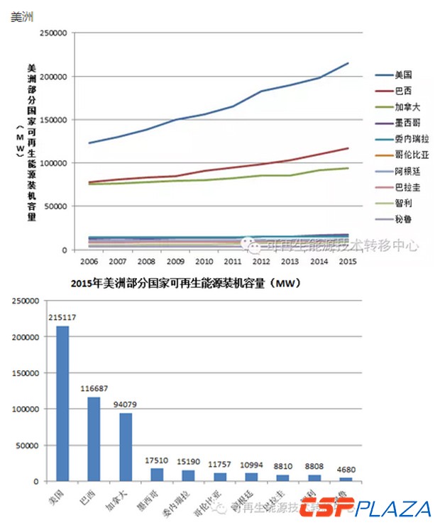 從2015年美洲可再生能源裝機容量來看,出了美國、巴西和加拿大,墨西哥、哥倫比亞和智利等發展中國家也正在積極發展可再生能源,增速可觀。