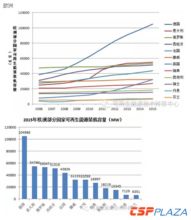 從2015年歐洲可再生能源裝機容量來看,德國排在第一位,之后分別是意大利、俄羅斯、西班牙、法國等國家。可以看到,除了俄羅斯,這些國家基本上集中于經濟發達的西歐地區。
