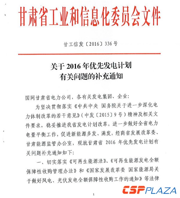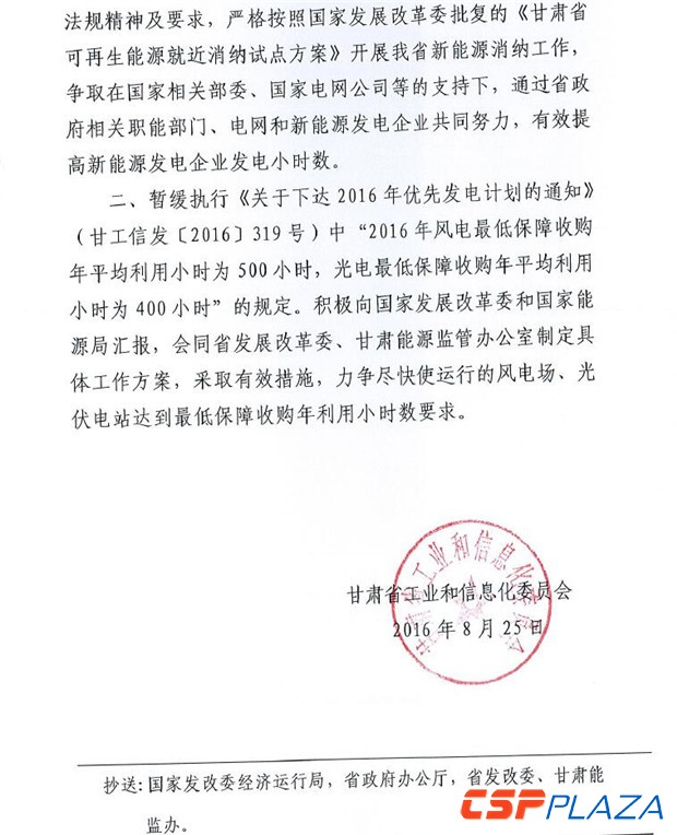 2016年8月25日,甘肅省工業和信息化委員會發布了名為《關于2016年優先發電計劃有關問題的補充通知》,通知指出,將暫緩執行《甘肅省工業和信息化委員會關于下達2016年優先發電計劃的通知》(甘工信發[2016]319號)中提出的“2016年風電最低保障收購年平均利用小時為500小時,光電最低保障收購年平均利用小時為400小時。”的規定。