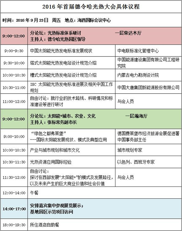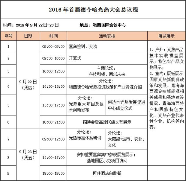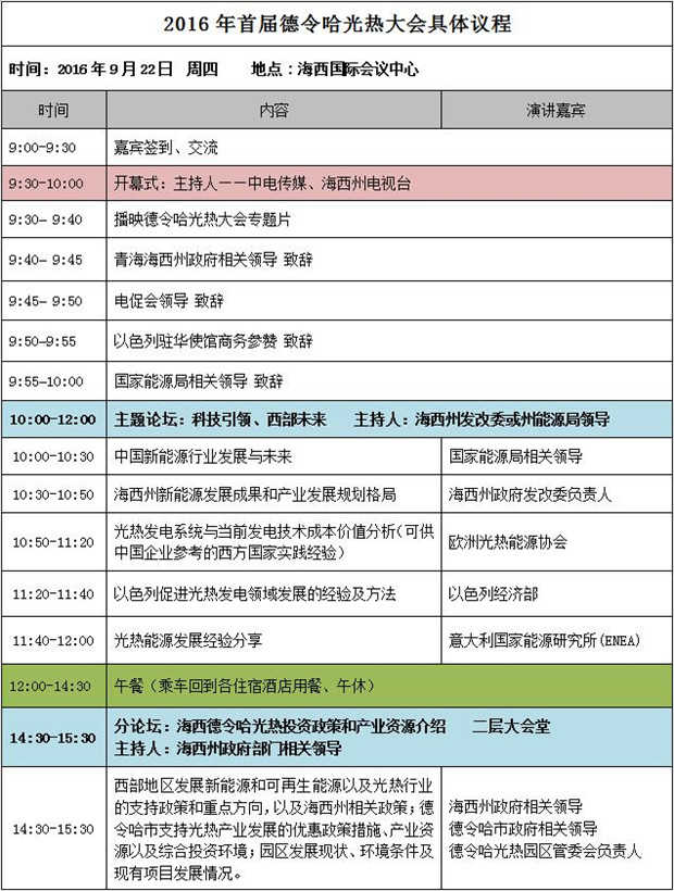 近(jin)日,由青海(hai)省(sheng)海(hai)西(xi)州(zhou)人民政府(fu)(fu)、青海(hai)省(sheng)能源(yuan)局主辦,青海(hai)省(sheng)德令哈(ha)(ha)市人民政府(fu)(fu)、中國電力發展促進會承辦,將于9月22~23日在海(hai)西(xi)州(zhou)德令哈(ha)(ha)市召開的(de)主題為(wei)“聚焦(jiao)清潔(jie)能源(yuan)高地,打(da)造世界光(guang)熱(re)之都”的(de)2016首(shou)屆德令哈(ha)(ha)國際光(guang)熱(re)大會的(de)最終(zhong)議程已經確定。