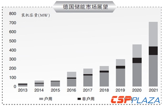 德國是全球最大的戶用儲能市場,而來自德國復興信貸銀行的持續補貼——為現有和新增光伏用戶配套儲能提供補貼,2013-2015年補貼額達到儲能系統成本的30%,2016年以后達到22%并且以每半年3%的速度下降。GTM預測,戶用儲能市場將繼續穩步增長,2021年德國市場戶用儲能容量將占到全部裝機容量的49%。