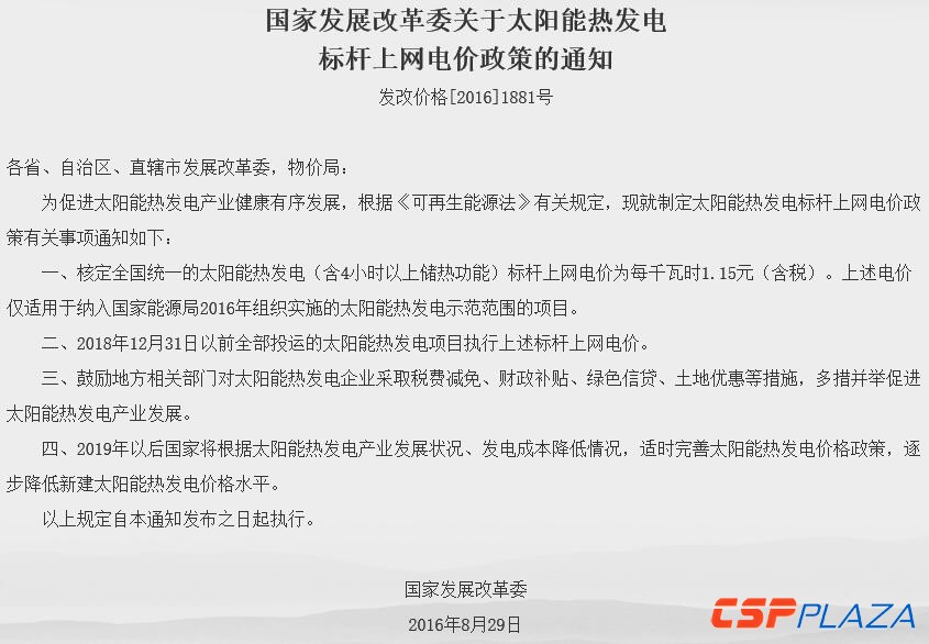 CSPPLAZA光熱發電網訊:國家發(fa)改委(wei)于(yu)9月2日正式發(fa)布(bu)《關于(yu)太陽(yang)能熱發(fa)電標桿上(shang)網電價政(zheng)策(ce)的(de)通知》,通知明確2018年(nian)12月31日以前全(quan)部投運的(de)太陽(yang)能熱發(fa)電項目執行1.15元的(de)標桿上(shang)網電價。