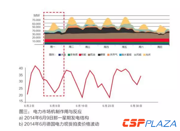 兩個案例有力證明了德國電力市場的有效性。第一個案例是2014年6月9日中午,光伏發電功率占比超過50%(圖三a)。那是一個公共假日,需求負荷低,光照良好,當天中午的光伏發電占比創了記錄。當日電力出口達到高峰,現貨拍賣價格也有所下降(圖三b),基于9日的情況,遠期市場價格也有所下降。