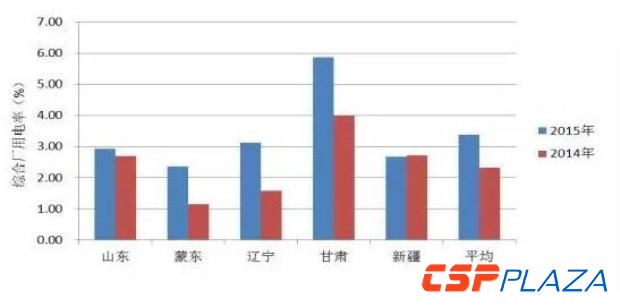 從蒙東、山東、甘肅、遼寧、新疆五個重點省份(地區)看,2015年平均綜合廠用電率為3.39%,同比增長46.07%。其中甘肅最高,為5.87%,蒙東最低,為2.37%。詳見下圖。