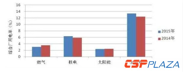 從全國看,2015年核電、生物質發電平均綜合廠用電率分別為6.38%、13.37%,同比分別增長8.14%、7.91%;燃氣發電、太陽能發電平均綜合廠用電率分別為3.06%、2.43%,同比分別下降14.29%、0.82%。詳見下圖。