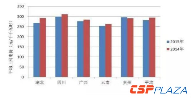 從四川、湖北、云南、貴州、廣西五個重點省份看,2015年平均上網電價為282.15元/千千瓦時,同比下降4.16%,其中四川最高,為298.14元/千千瓦時,云南最低,為252.94元/千千瓦時。詳見下圖