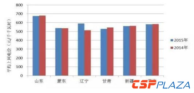 從蒙東、山東、甘肅、遼寧、新疆五個重點省份(地區)看,2015年平均上網電價為580.21元/千千瓦時,同比下降0.66%,其中山東最高,為674.26元/千千瓦時,甘肅最低,為529.78元/千千瓦時。詳見下圖。