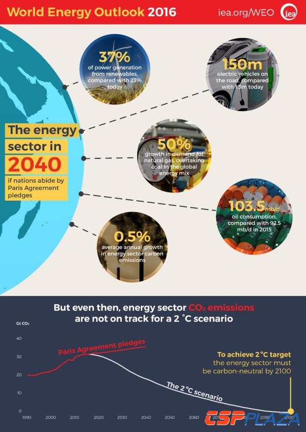 報告稱,11月4日《巴黎協定》正式生效,意味著全球邁出對抗全球變暖的重要一步。《巴黎協定》的目標是在本世紀末將全球升溫幅度控制在“遠低于前工業化水平之上2攝氏度”,并努力把升溫限制在1.5攝氏度。IEA報告根據《巴黎協定》中190多個國家的承諾和當前各國形勢做出了主要情景(mainscenario)分析。