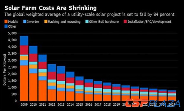 而彭博新能源財經的首席新能源分析師Jenny Chase在報告中指出,全球1MW以上的地面太陽能系統平均成本為1.14美元/W;而到2025年時,這個數字將被降為0.73美分,成本減少36%。
