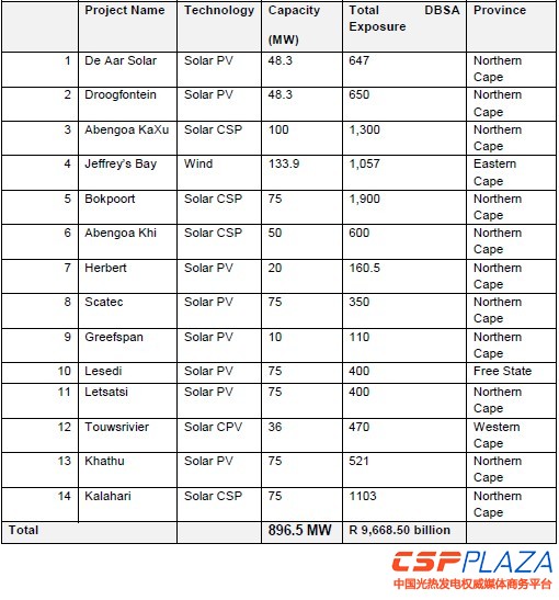 貸款將覆蓋共計約896.5MW的供給14個可再生能源項目,其中13個為太陽能項目,一個風電項目,其中光熱發電項目有四個,分別是阿本戈100MW的KaXu電站(1,300百萬蘭特)、阿本戈50MW的Khi電站(600百萬蘭特)、75MW的Bokpoort電站(1900百萬蘭特)、75MW的Kalahari電站(1,103百萬蘭特)。總計300MW,總計貸款支持規模達4903百萬蘭特。