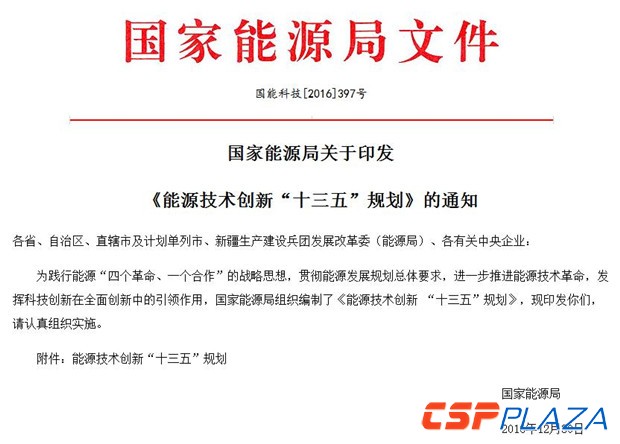 CSPPLAZA光熱發電網訊:近日,國家能源局印發《能源技術創新“十三五”規劃》( 以下簡稱《規劃》)。作(zuo)為可再生能(neng)源的重要分支(zhi),光熱發電在《規(gui)劃》中被重點提及。