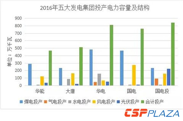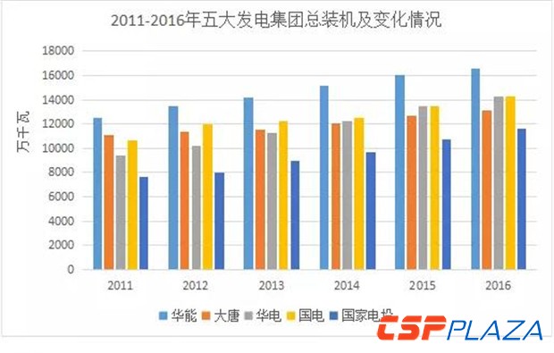 2016年五大發電集團總裝機:華能第一,16554萬千瓦;華電第二,14281萬千瓦;國電第三,14248萬千瓦;大唐第四,13090萬千瓦;國家電投第五,11663萬千瓦。