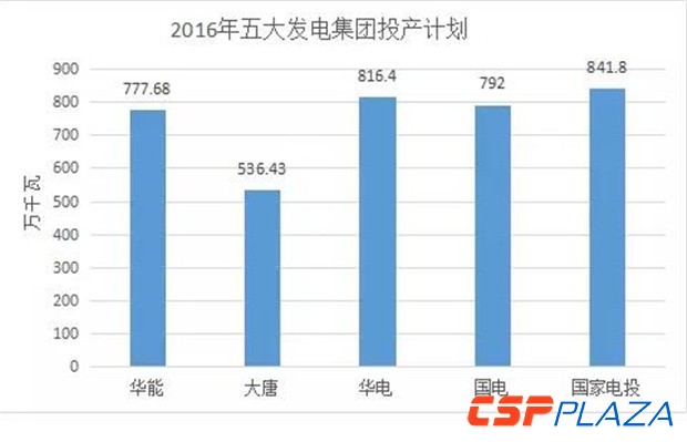 2016年五大發電集團投產計劃:國家電投第一,841.8萬千瓦;華電第二,816.4萬千瓦;國電第三,792萬千瓦;華能第四,777.68萬千瓦;大唐第五,536.43萬千瓦。