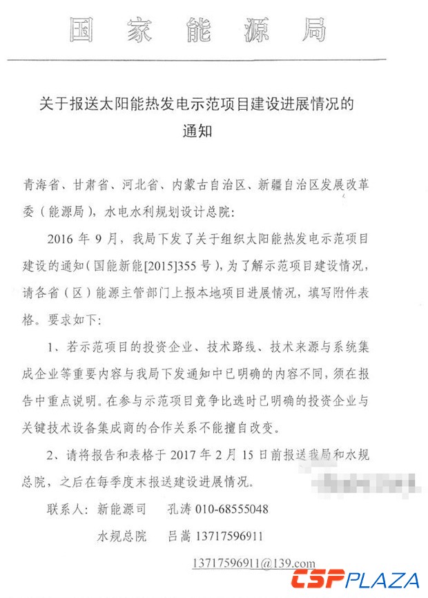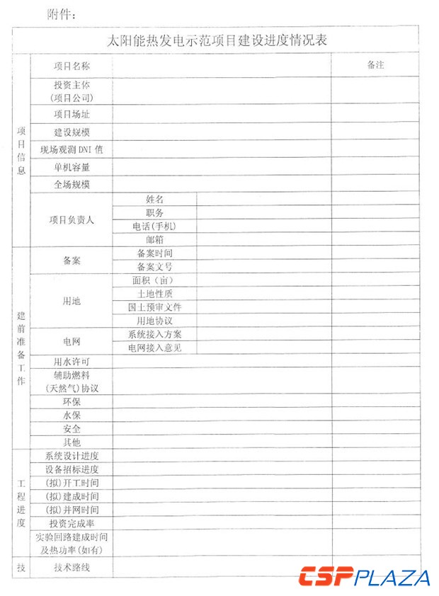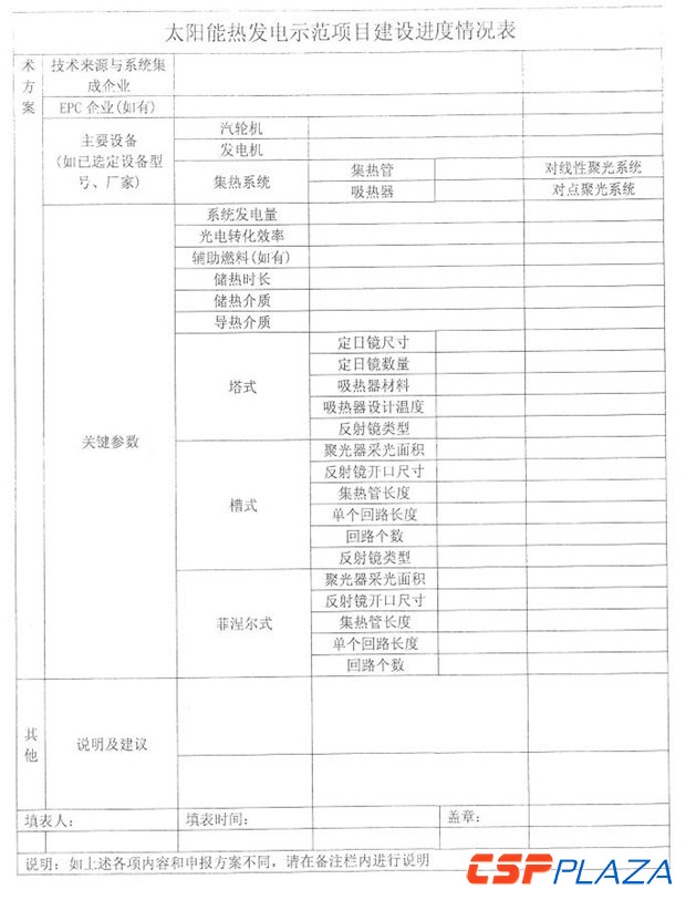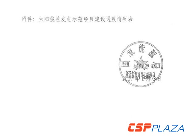 CSPPLAZA光熱發電網訊:近日,國家能源局發(fa)布(bu)《關于報(bao)送太陽能熱發電示范項目建(jian)設進(jin)展情況的通知》(以下簡稱(cheng)“通知”)。為了解示范項目(mu)建設情況,各(ge)省(sheng)區能源主管部門須(xu)上報本地項目(mu)進展情況。