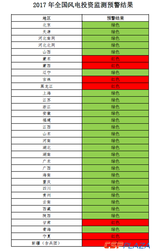 一、2017年風電投資監測預警結果:內蒙古、黑龍江、吉林、寧夏、甘肅、新疆(含兵團)等省(區)為風電開發建設紅色預警區域。其他省份為綠色區域。
