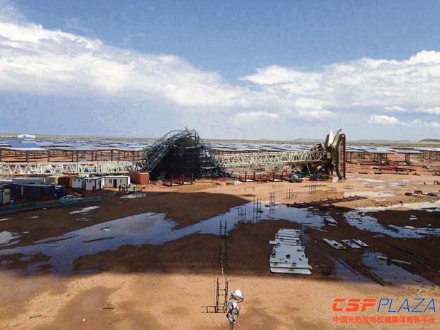 3.2016年8月下旬,位于德令哈的三大光熱項目——中廣核50MW槽式電站、青海博昱50MW槽式電站和中控10MW塔式電站遭遇了德令哈數年不遇的強降雨侵襲。中控項目因早已建成,項目園區的防洪設施齊備,整個廠區并未受到太大影響。在建中的中廣核項目,由于常規島和儲熱島已開建,具有一定洪水應對措施,有效抵擋了降雨的影響;而太陽島因未正式開建,平臺間防護坡尚未加固,導致洪水從較高地勢涌入,后續需進行平臺修整工作。另一在建的青海博昱50MW項目,場平完成后尚未大規模開建,同樣由于防護坡尚未加固,導致洪水侵入,后續需進行場平修整。