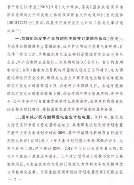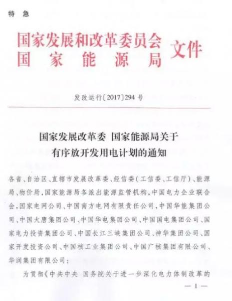《國家發改委、國家能源局關于有序放開發用電計劃的通知》文件近日正式下發。該文件涉及的政策要點如下:加快發電企業與購電主體簽訂購電協議;逐年減少既有燃煤發電企業計劃用電量;原則上不再安排9號文件實施后核準的煤電機組;規范和完善市場化交易電量價格調整機制;有序開放跨省區送受電計劃;優先保障風電、太陽能、核電等新能源發電;參與市場交易的電力用戶不再執行目錄電價。