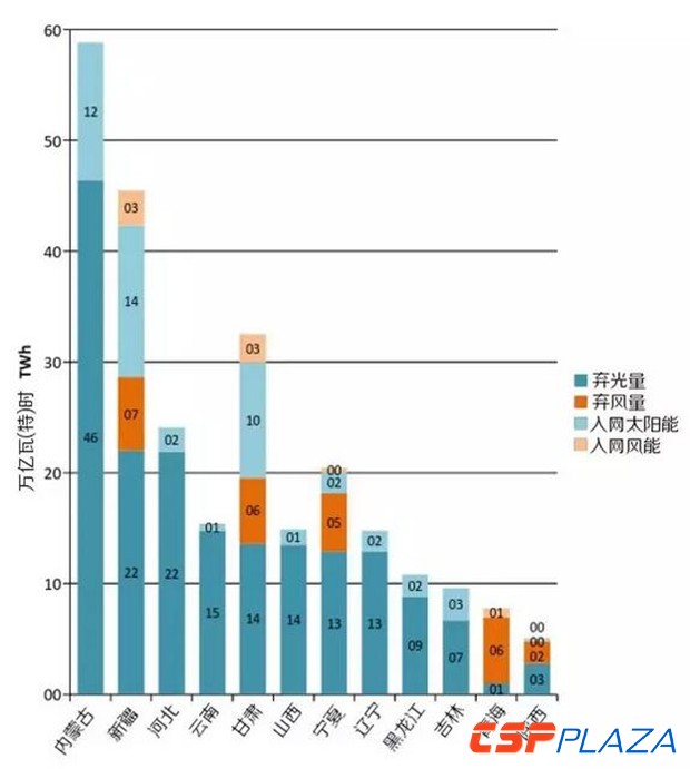 棄風棄光現象在光照充足、風力充沛的中國西北部地區最為明顯。2016年,甘肅棄風棄光率為40%,而新疆則為37%。甘肅、新疆和內蒙古是中國風能與太陽能裝機容量最高的地區,新能源在能源生產中所占的比重也較大。