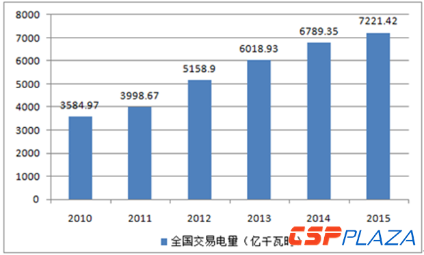圖:2010-2015年全國交易電量快速增長(數據來源:公開(kai)資料(liao)整理(li))