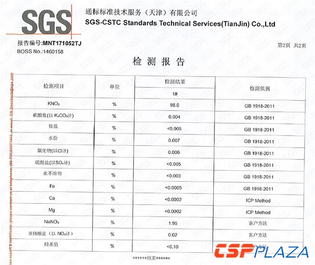 特點:純堿中的NaCl及其它熔鹽要求指標通過工藝進行處理,氯化物(以NaCl計)≤0.06,最低可以做到0.02,是國內硝酸鈉的最好產品,詳見化驗單。