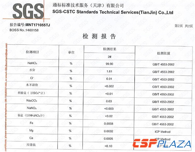 為更好為光熱發電行業服務,上海鹽湖文通相關生產企業結合實際開發出了更加合理匹配的新結構組份熔鹽產品,既滿足了熔鹽市場需求,又提高了工廠生產效率,不但主要大指標能夠滿足熔鹽用戶需求,而且相關小指標特別是Cl、Mg等離子更加優于國標要求,為光熱發電系統后期的長期穩定運行提供了良好的條件和可靠的保障。