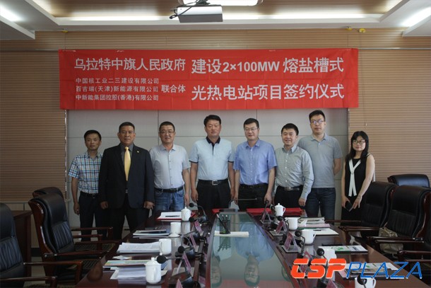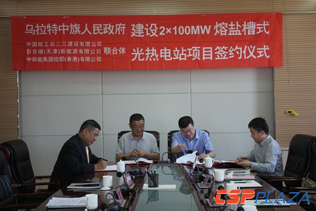 CSPPLAZA光熱發電網訊:6月 1日(ri)上午,由(you)中(zhong)國(guo)核工業二三(san)(san)建(jian)設有限公司(簡(jian)稱中(zhong)核二三(san)(san))、百吉(ji)瑞(天(tian)津(jin))新(xin)能(neng)源(yuan)有限公司(簡(jian)稱百吉(ji)瑞)與中(zhong)新(xin)能(neng)集團控股(香港)有限公司(簡(jian)稱中(zhong)新(xin)能(neng))三(san)(san)方(fang)組成的聯合體與烏拉特(te)中(zhong)旗人民政府(fu)簽署(shu)了(le)關于在烏拉特(te)中(zhong)旗建(jian)設2×100MW熔(rong)鹽槽式(shi)光熱(re)發(fa)(fa)電項目的合作開發(fa)(fa)框架協議。