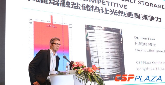 CSPPLAZA光熱發電網訊:中國光熱發電行業最大規模、層次最高的國際性年度盛會中國國際光熱電站大會暨CSPPLAZA年會2017(CPC2017)于2017年6月14~16日在杭州召開。弗勞恩霍夫研究院(Fraunhofer ISE)光熱項目總監Tom Fluri出席了本次會議并發表演講,著重介紹了創新型單罐熔鹽儲熱系統在建造和運行中的成本優勢,詳細解析了單罐儲熱如何讓光熱電站更具競爭力。