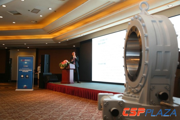 CSPPLAZA光熱發電網訊:塔式光熱發電對聚光精度的要求較高,由此對回轉減速器提出了很高要求,比如超高精度、免維護、高防護要求等。銀川威力傳動技術股份有限公司(簡稱威力傳動)日前成功推出了適合中國西北特殊開發環境的國產回轉驅動系統,在中國國際光熱電站大會暨CSPPLAZA年會2017(CPC2017)期間舉辦了新品發布會,并在發布會現場展示了其重達800公斤的最新機型,引得眾多參會嘉賓駐足圍觀。